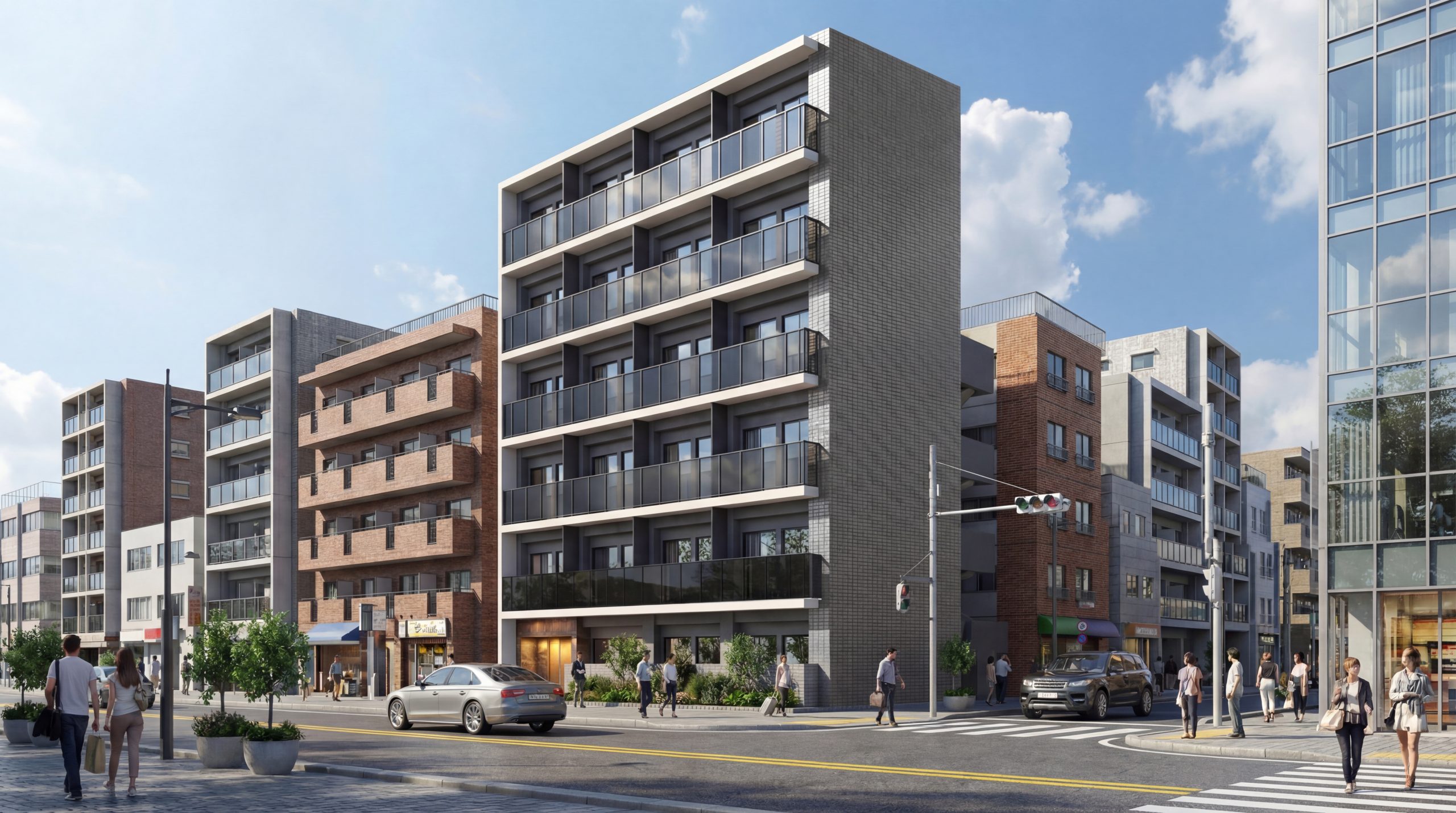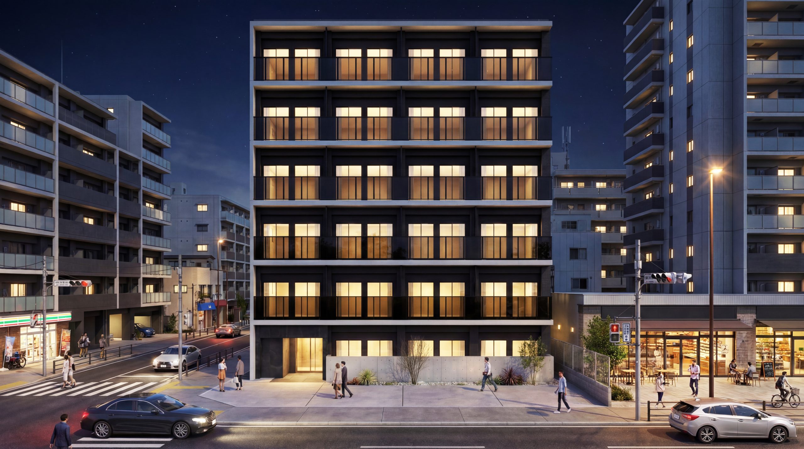今回のような架空の建物であれば、敷地や周辺情報はAIに完全に任せてしまうことで、次のように一瞬で背景を作り出してくれます。