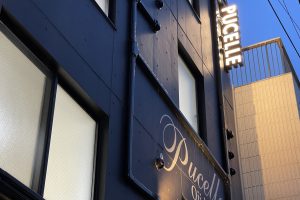 ダークグレーの大きな壁面でクラシカルな印象を与えつつ、奥まったアプローチは照明で演出し、内部はカジュアルなサインで親しみやすさを加えています。