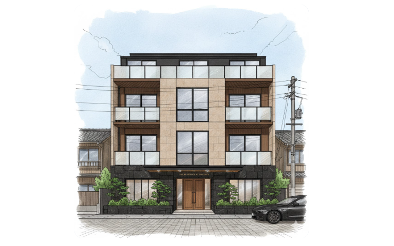- 課題: 競合物件がひしめく駅前の激戦区。接道面しか見えないため、雑多な街に埋没しない個性のある「顔作り」が求められました。