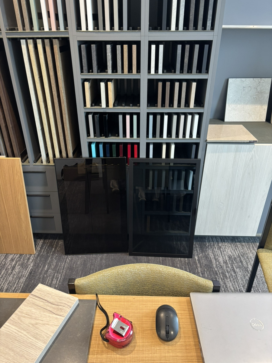 キッチンだけではなく、キッチン周りの収納棚や収納棚の扉、ガラスの素材や色などを選定します。