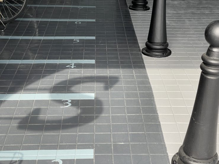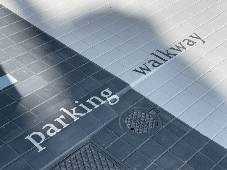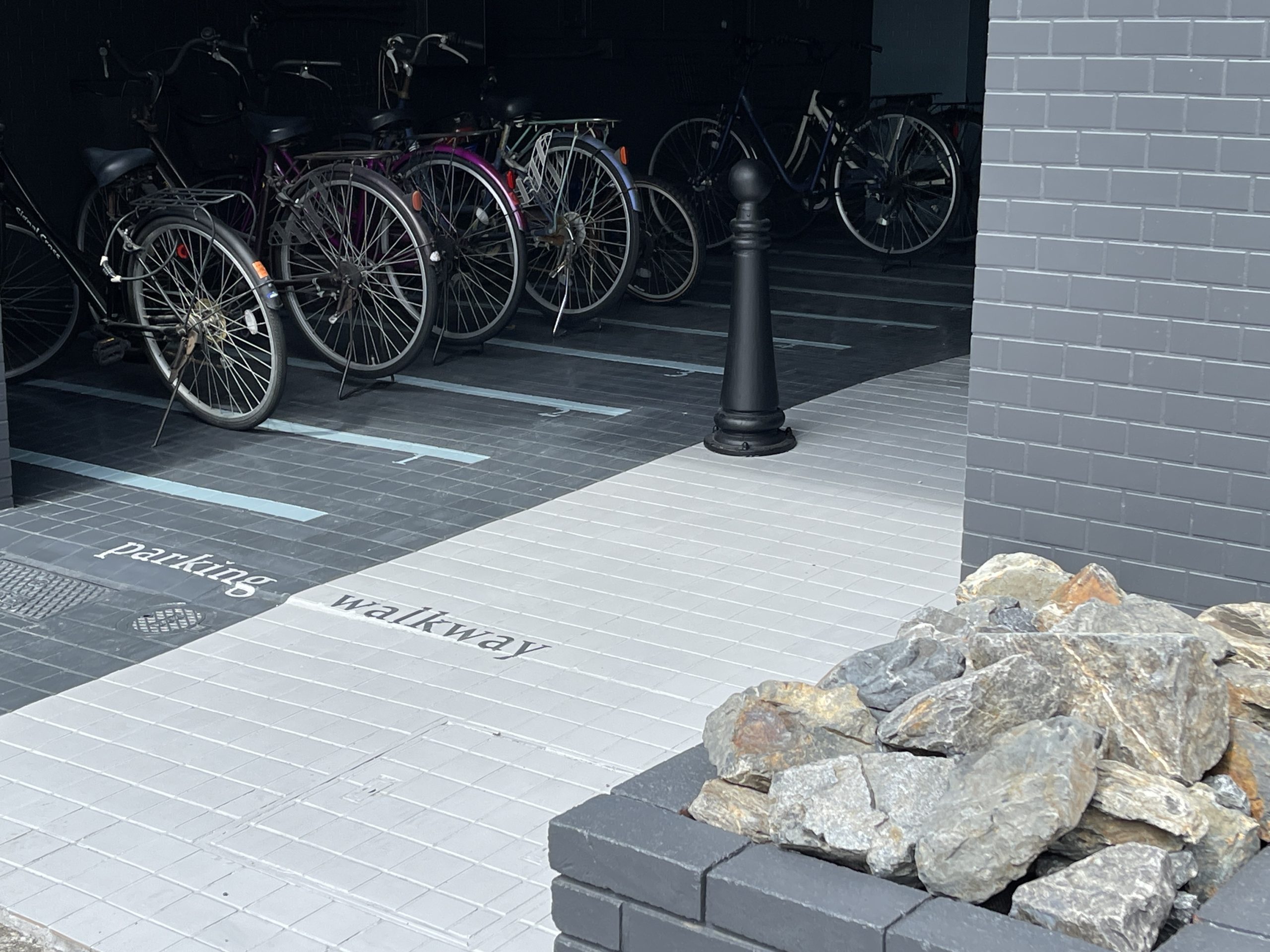駐輪スペースと歩行スペースはペイントとサインでゾーニング。