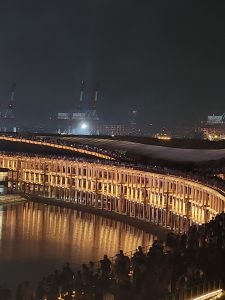 リングの上からは万博のパビリオンが一望できました。夜間という事もあり各国パビリオンのカラーが映えています。