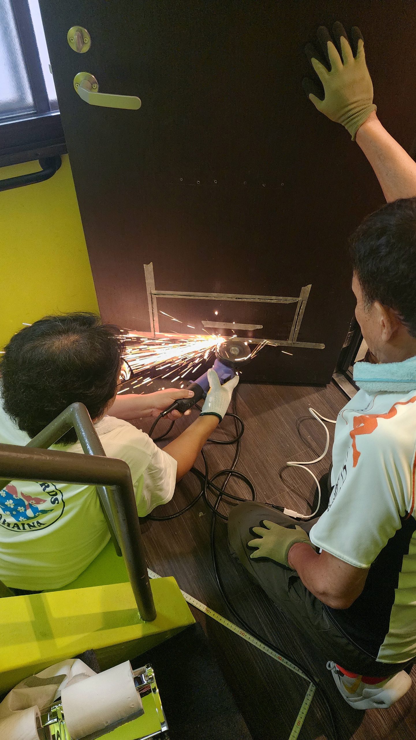 この作業では、ドアに開口部を作る必要があり、丸ノコで型をくり抜くという大掛かりな工程もありました。