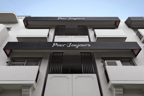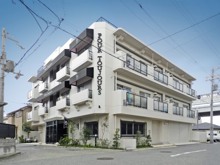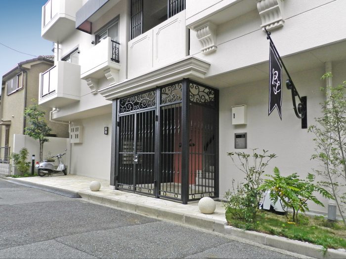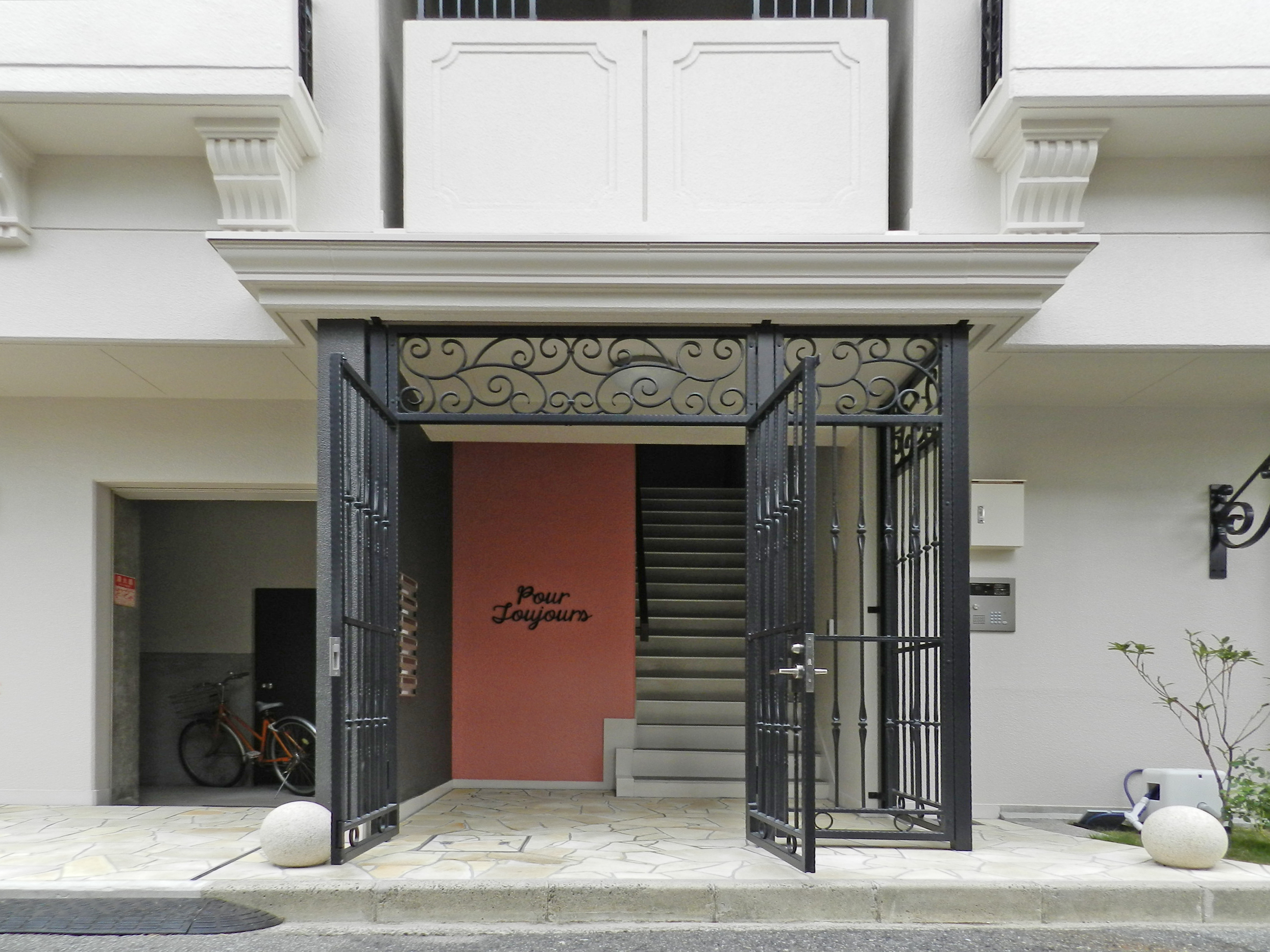 美しいアイアンワークが主役のリノベーションは、アクセントカラーに上品なサーモンピンクを用い、女性らしく優しい印象になるようデザインしました。しかし白とピンクだけでは、甘くぼやけた印象になるので、ダークグレーと併せて使うのがポイントです。