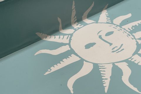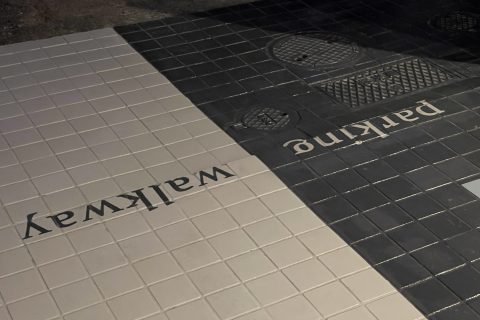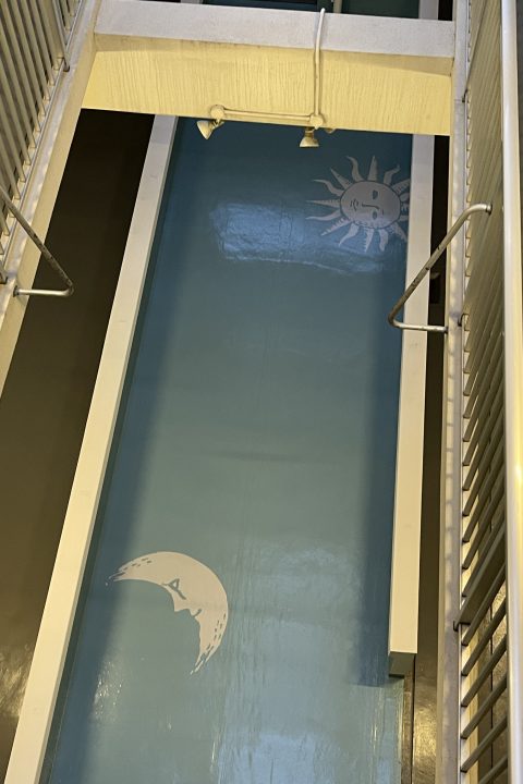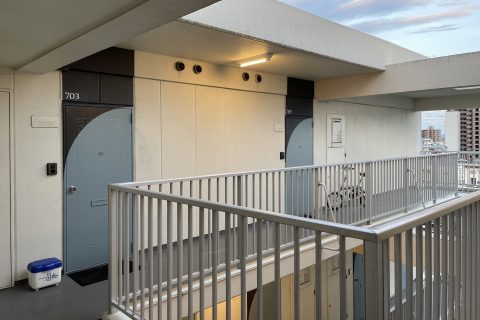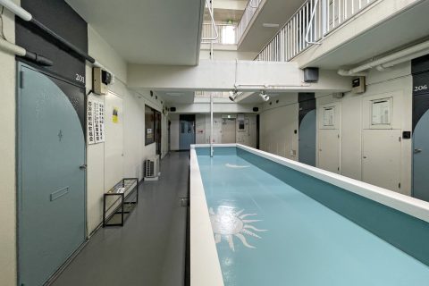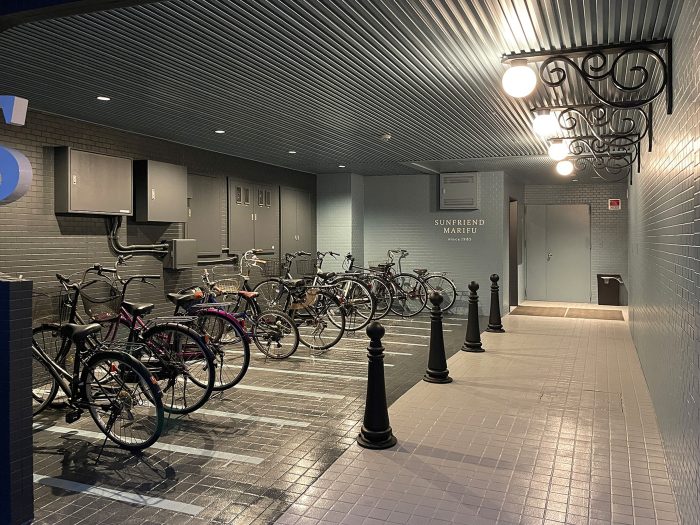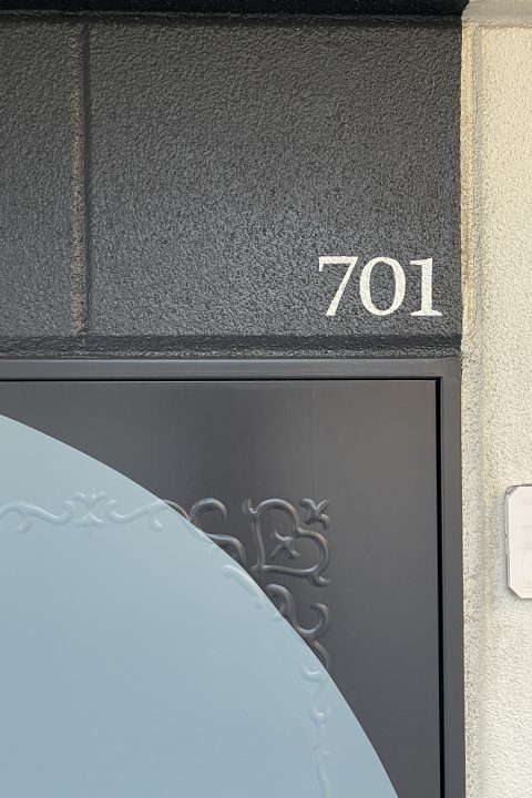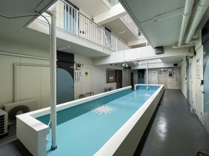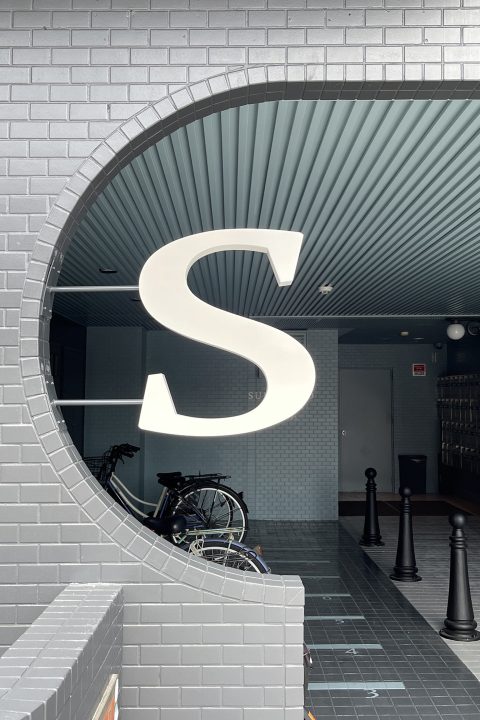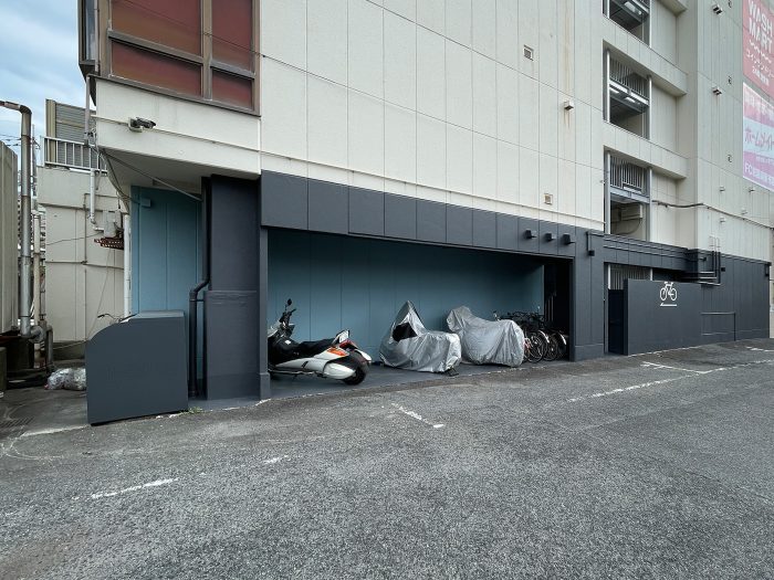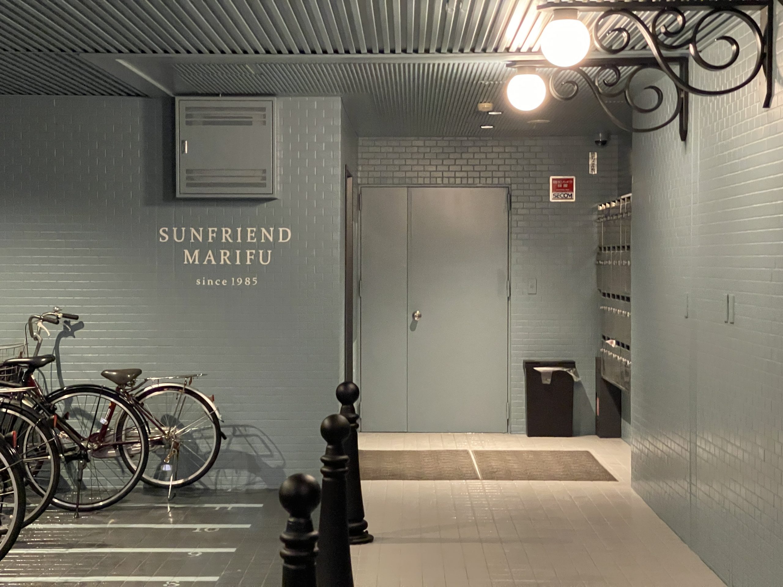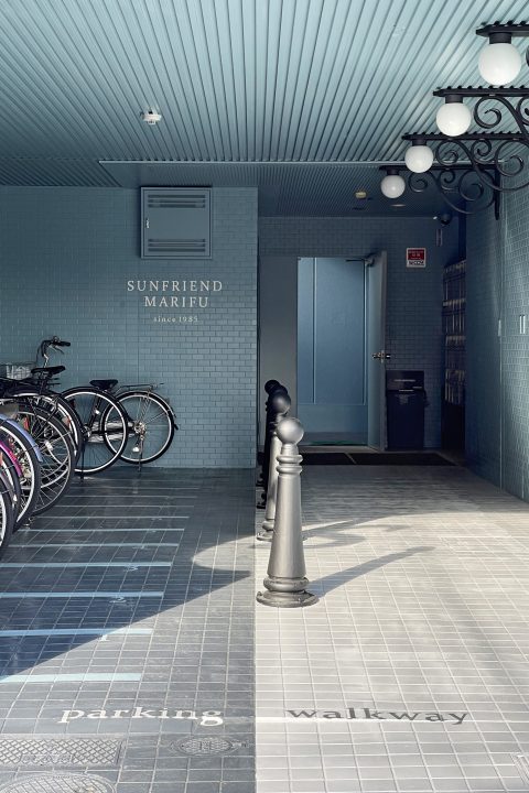 外観をマットなダークグレーで引き締めつつ、内部のアプローチには鮮やかなフレンチブルーを用いて劇的な対比を演出しました。この配色は、単に空間を美しく彩るだけでなく、動線を視覚的に分けることで居住者のマナー向上を促す機能も想定しています。さらに、ロートアイアンや照明などのクラシカルな装飾と、特徴的なグラフィックサインを組み合わせることで、訪れる人を「蒼天のアプローチ」へと誘う独自の世界観を創り出しました。