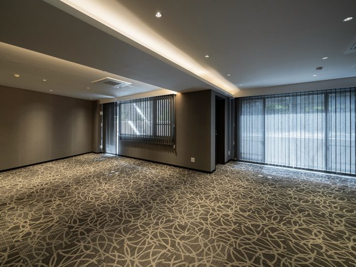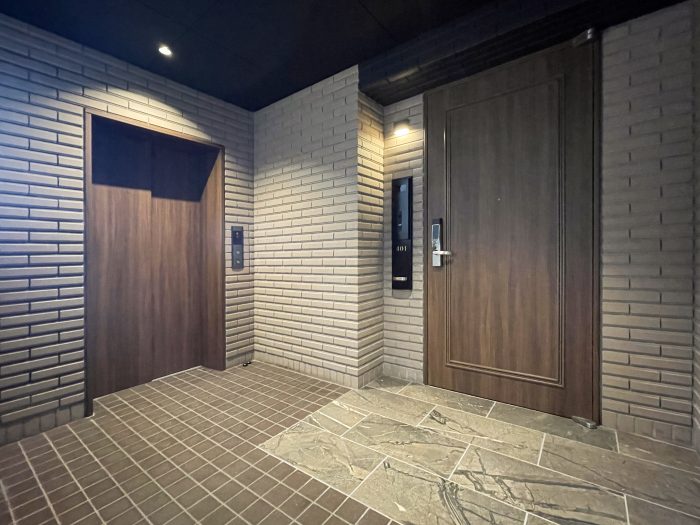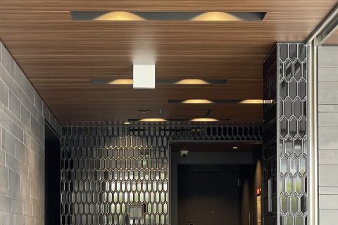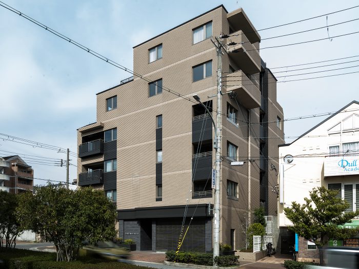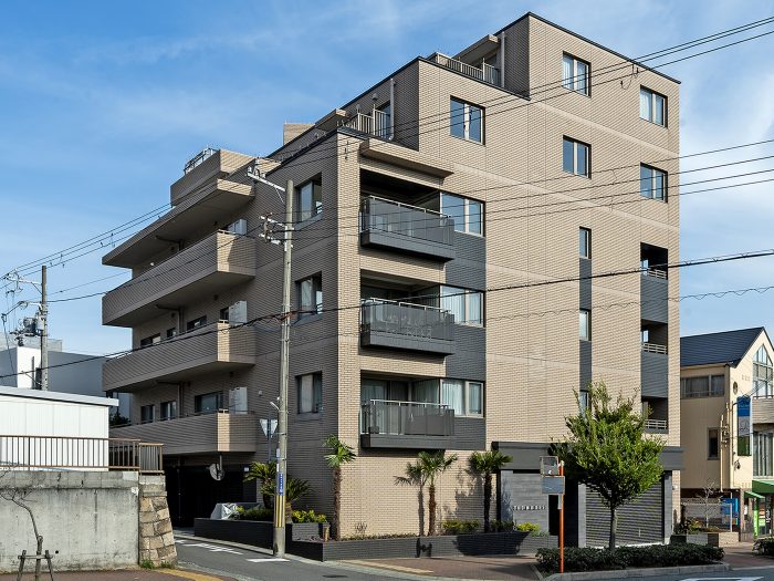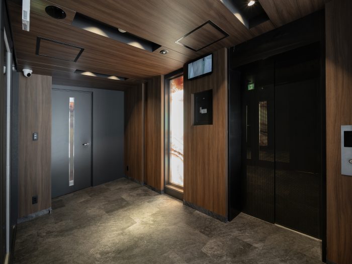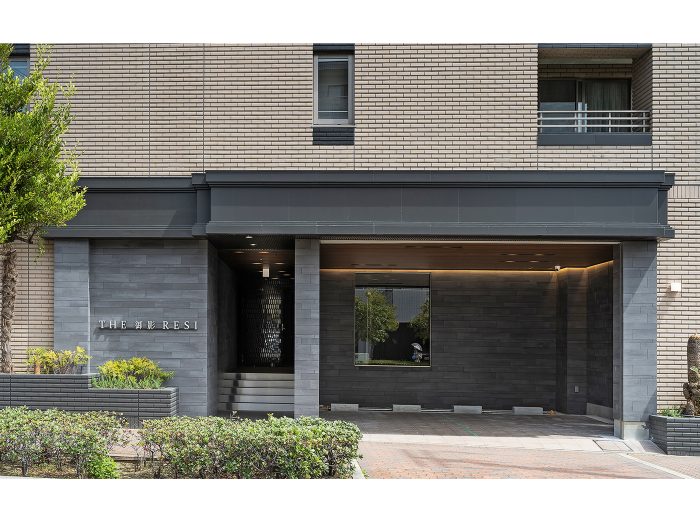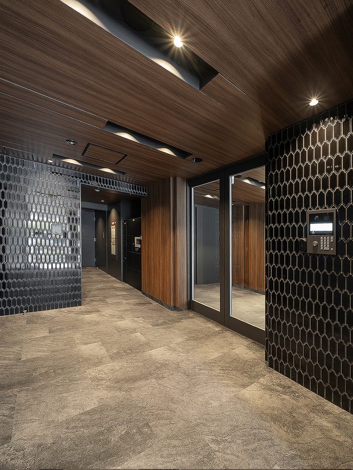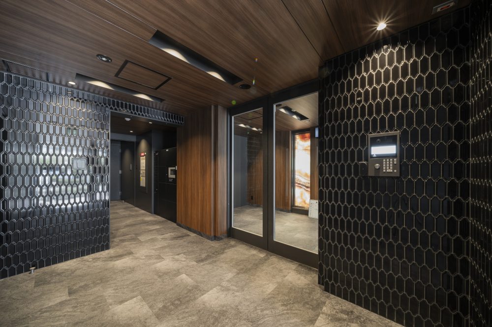 既存の味わい深い外壁タイルを最大限に活かすため、庇などの建築パーツをチャコールで引き締め、メリハリのある現代的なファサードを構築。エントランスや駐車場には木調素材を用いて統一感を持たせ、照明計画によって昼夜問わずラグジュアリーな雰囲気を演出しています。また、共用部においては、素材や色彩でゾーニングを行うとともに、設備類をすっきりと納めることで空間を広く見せ、ホテルライクでホスピタリティあふれる空間デザインとしています。